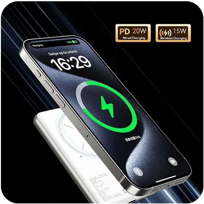 یکی از ویژگیهای منحصربهفرد این پاوربانک، قابلیت شارژ بیسیم یا وایرلس آن است. این قابلیت با توان 15 وات، شما را از استفاده از کابل بینیاز میکند. تنها کافی است دستگاه خود را روی پاوربانک قرار دهید تا فرآیند شارژ آغاز شود. این ویژگی بهخصوص برای افرادی که همیشه در حرکت هستند، بسیار مفید است و باعث راحتی بیشتر در استفاده میشود.